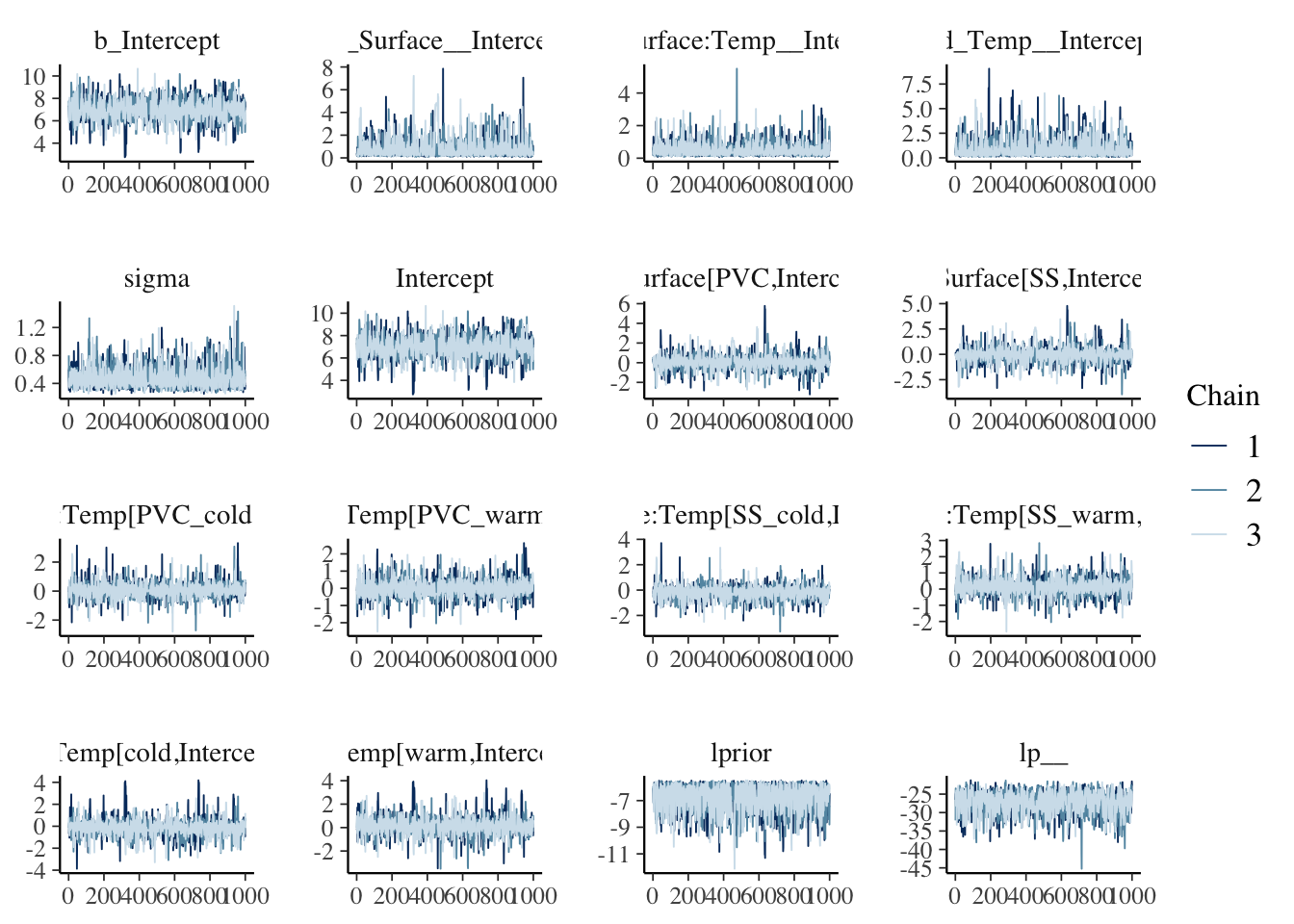 data = dat)After model fitting, we need to make sure that the sampler reached the stationary distribution. Some visual and quantitative model checks: